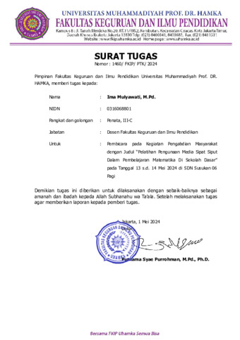 Ima Mulyawati, IM Surat Tugas Dekan Narasumber Sipat Siput. Universitas Muhammadiyah Prof Dr Hamka. (Unpublished)