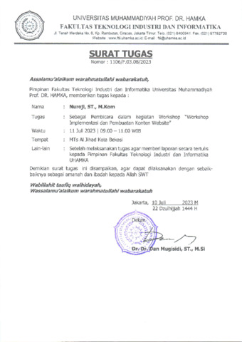 Nuroji, Nuroji (2023) SK Sebagai Pembicara dalam kegiatan Workshop "Workshop Implementasi dan Pembuatan Konten Website". uhamka. (Unpublished)