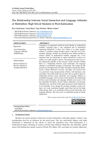 Lestari, Melina The Relationship between Social Interaction and Language Attitudes of Multiethnic High School Students in West Kalimantan. Al Ishlah Jurnal Pendidikan, 16 (2). pp. 1972-1979. ISSN 2087-9490