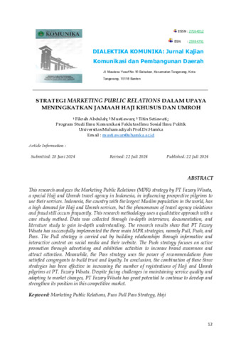 Mustiawan, Mustiawan JURNAL PENELITIAN : STRATEGI MARKETING PUBLIC RELATIONS DALAM UPAYA MENINGKATKAN JAMAAH HAJI KHUSUS DAN UMROH (22 Juli 2024). DIALEKTIKA KOMUNIKA: Jurnal Kajian Komunikasi dan Pembangunan Daerah.