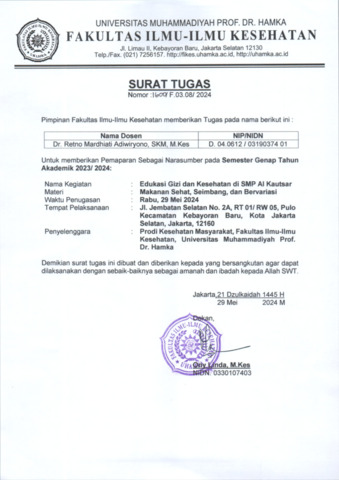 Mardhiati A, S.KM., M.Kes, Dr. Surat Tugas Kegiatan Pengabdian Masyarakat SMP Al Kautsar. Universitas Muhammadiyah Prof. Dr. Hamka. (Unpublished)