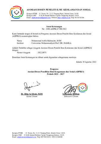 rahmanto, arifin Menjadi anggota ASOSIASI DOSEN PENELITI ILMU KEISLAMAN DAN SOSIAL (ADPIKS). UHAMKA.