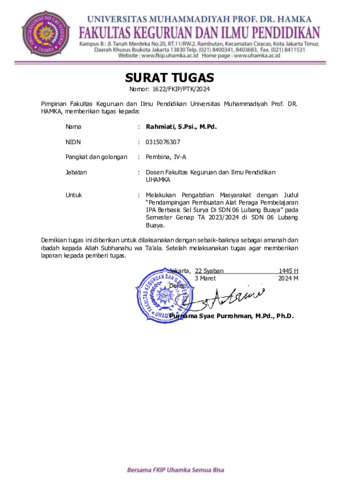 Rahmiati, Rahmiati Surat Tugas Pengabdian Masyarakat di sdn 06 Lubang Buaya. Universitas Muhammadiyah Prof. Dr. Hamka. (Unpublished)