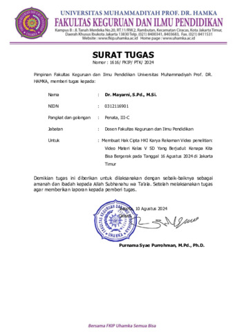 Mayarni, Mayarni Surat tugas Membuat Hak Cipta HKI Karya Rekaman Video penelitian: Video Materi Kelas V SD Yang Berjudul: Kenapa Kita Bisa Bergerak. Universitas Muhammadiyah. Prof. DR. Hamka. (Unpublished)