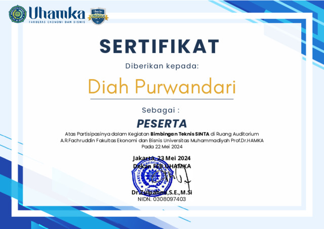 purwandari, diah Sertifikat Bimbingan Teknis SINTA. FEB UHAMKA. (Submitted)