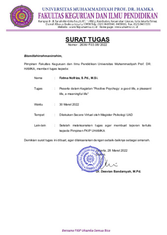 Fatma Nofriza, Fatma Peserta Psychology Positif. Universitas Muhammadiyah Prof Dr. Hamka. (Unpublished)