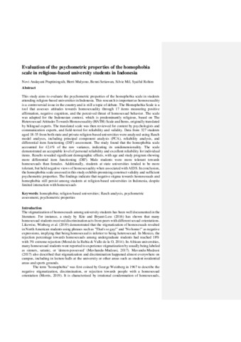 Novi Andayani Praptiningsih, NAP dan Herri Mulyono, Herri dan Mil, Silvie dan Syaiful Rohim, Aim (2024) Evaluation of the psychometric properties of the homophobia scale in religious-based university students in Indonesia. Evaluation of the psychometric properties of the homophobia scale in religious-based university students in Indonesia, 249. (Unpublished)