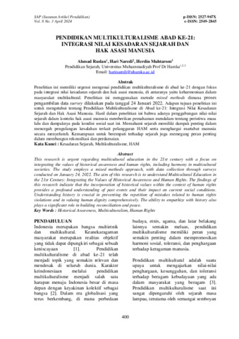 Ahmad Ruslan, Ahmad Ruslan dan Hari Naredi, Hari Naredi dan Herdin Muhtarom, Herdin PENDIDIKAN MULTIKULTURALISME ABAD KE-21: INTEGRASI NILAI KESADARAN SEJARAH DAN HAK ASASI MANUSIA. PENDIDIKAN MULTIKULTURALISME ABAD KE-21: INTEGRASI NILAI KESADARAN SEJARAH DAN HAK ASASI MANUSIA, 8 (3). pp. 400-407. ISSN 2549-2845