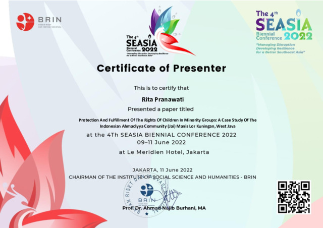 Pranawati, Rita Sertifikat Presenter pada the 4th SEASIA BIENNIAL CONFERENCE. Universitas Muhammadiyah Prof Dr. HAMKA. (Unpublished)