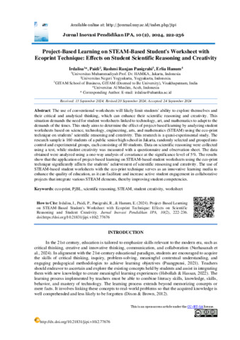 IRDALISA, IRDALISA Project-Based Learning on STEAM-Based Student's Worksheet with Ecoprint Technique: Effects on Student Scientific Reasoning and Creativity. Jurnal Inovasi Pendidikan IPA.