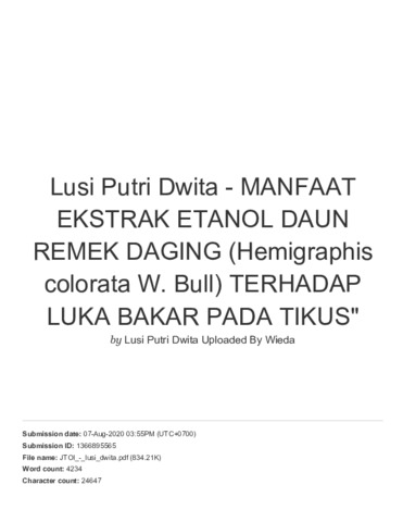 Lusi Putri Dwita - MANFAAT EKSTRAK ETANOL DAUN REMEK DAGING (Hemigraphis colorata W. Bull) TERHADAP LUKA BAKAR PADA TIKUS_.pdf Download (2MB) | Preview |