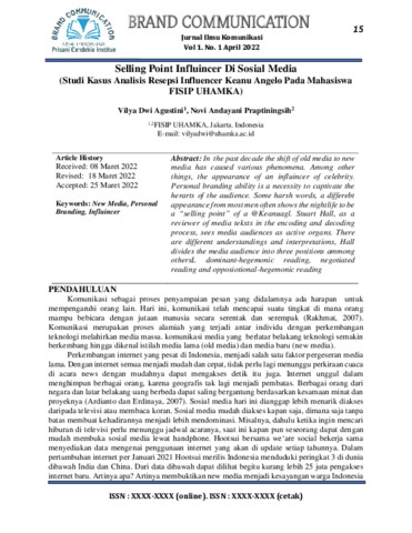 Novi Andayani Praptiningsih, NAP Selling Point Influincer Di Sosial Media (Studi Kasus Analisis Resepsi Influencer Keanu Angelo Pada Mahasiswa FISIP UHAMKA). Brand CommunicationL Jurnal Ilmu Komunikasi.