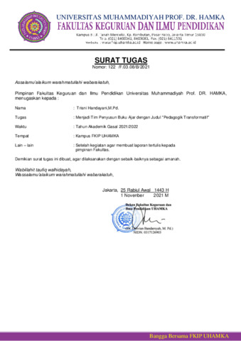 Handayani, Trisni Surat Tugas dan Buku Pedagogik Transpormatif. Uhamka. (Unpublished)