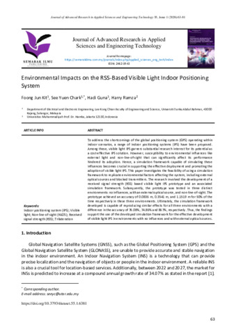 Ramza, Harry (2024) Environmental Impacts on the RSS-Based Visible Light Indoor Positioning System. Journal of Advanced Research in Applied Sciences and Engineering Technology, 55 (1). pp. 63-81. ISSN 2462 - 1943
