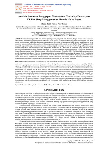 E-commerce has become an important role in driving the economy, many business actors, especially MSMEs, depend on selling their products online. E-commerce continues to experience extraordinary growth, many breakthroughs have been made to improve its systems and services. One of them is social commerce which utilizes social interactions from social network users, for example TikTok Shop. However, the government changed regulations regarding social commerce which resulted in the closure of TikTok Shop operations in Indonesia, which many reactions and opinions from the public. Therefore this research was conducted with aim of analyzing public sentiment towards the closure of TikTok Shop. This research uses 1233 data taken and collected from social media X in the range September to December 2023. This research also uses the Naïve Bayes Classifier algorithm method with a training data to test data ratio of 80:20. This research resulted in accuracy of 90,24%, precision of 74,33%, and recall of 100%. The large number of negative sentiments in this sentiment analysis shows the public’s disappointment with the policy changes carried out by the government which resulted in the closure of TikTok Shop operations in Indonesia.