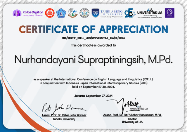 Supraptiningsih, Nurhandayani Sertifikat Pembicara ICEll Univ. LIA. Uni. LIA. (Unpublished)