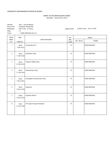 Muzakir, Haris Bukti Kinerja Pengajaran MK K3 Dasar Kelas 1C. Fikes Uhamka.