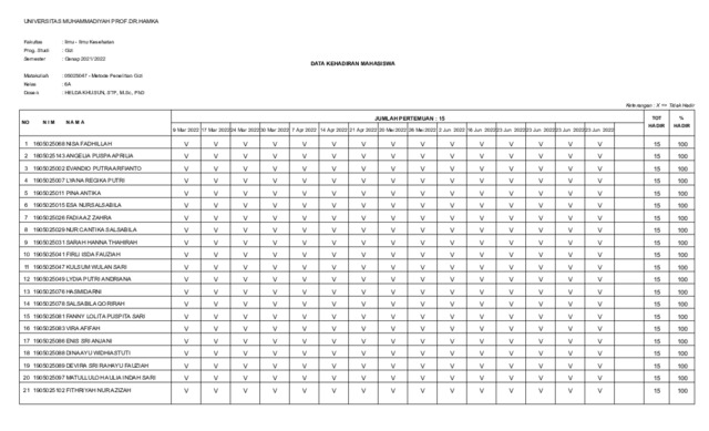 Khusun, Helda Absensi BAP Metlit Gizi 6A Genap 2021/2022. Program Studi Ilmu Gizi Fakultas Ilmu-Ilmu Kesehatan Universitas Muhammadiyah Prof Dr HAMKA. (Unpublished)