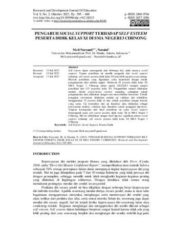 Nuraini, Nuraini (2023) Pengaruh Social Support terhadap Self Esteem Peserta Didik Kelas XI di SMA Negeri 3 Cibinong. RDJE, 9 (2). pp. 595-600. ISSN 2657-1056