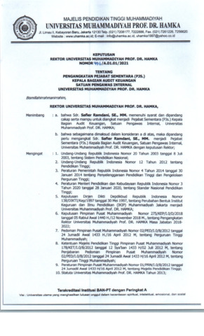 Safier Ramdani, Safier SK Pengangkatan PJS Kepala Bagian Keuangan SPI Uhamka. Uhamka.