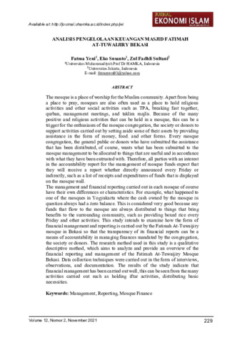 The mosque is a place of worship for the Muslim community. Apart from being a place to pray, mosques are also often used as a place to hold religious activities and other social activities such as TPA, breaking fast together, qurban, management meetings, and taklim majlis. Because of the many positive and religious activities that can be held in a mosque, this can be a trigger for the enthusiasm of the mosque congregation, the society or donors to support activities carried out by setting aside some of their assets by providing assistance in the form of money, food. and other forms. Every mosque congregation, the general public or donors who have submitted the assistance that has been distributed, of course, wants what has been submitted to the mosque management to be allocated to things that are useful and in accordance with what they have been entrusted with. Therefore, all parties with an interest in the accountability report for the management of mosque funds expect that they will receive a report whether directly announced every Friday or indirectly, such as a list of receipts and expenditures of funds that is displayed on the mosque wall. The management and financial reporting carried out in each mosque of course have their own differences or characteristics. For example, what happened to one of the mosques in Yogyakarta where the cash owned by the mosque in question always had a zero balance. This is considered very good because any funds that flow to the mosque are always distributed to things that bring benefits to the surrounding community, such as providing boxed rice every Friday and other activities. This study intends to examine how the form of financial management and reporting is carried out by the Fatimah At-Tuwaijiry mosque in Bekasi so that the transparency of its financial reports can be a means of accountability in managing finances mandated by the congregation, the society or donors. The research method used in this study is a qualitative descriptive method, which aims to analyze and provide an overview of the financial reporting and management of the Fatimah At-Tuwaijiry Mosque Bekasi. Data collection techniques were carried out in the form of interviews, observations, and documentation. The results of the study indicate that financial management has been carried out well, this can be seen from the many activities carried out such as holding iftar activities, distributing basic necessities.