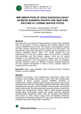 Susanto, Eko IMPLEMENTATION OF INFAQ SHODAQOH ZAKAT ON MICRO BUSINESS GROWTH AND MUSTAHIQ WELFARE AT LAZISMU SERVICE OFFICE. IMPLEMENTATION OF INFAQ SHODAQOH ZAKAT ON MICRO BUSINESS GROWTH AND MUSTAHIQ WELFARE AT LAZISMU SERVICE OFFICE.