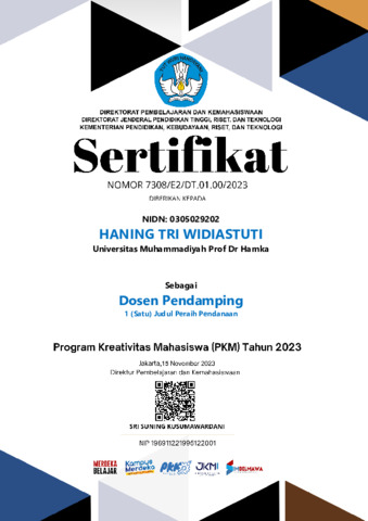 Tri Widiastuti, Haning Sertifikat Pembimbing PKM. KEMENDIKBUDRISTEK. (Unpublished)