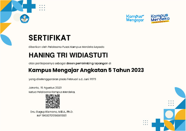 Tri Widiastuti, Haning Sertifikat DPL KM5. Pelaksana Pusat Kampus Merdeka. (Unpublished)