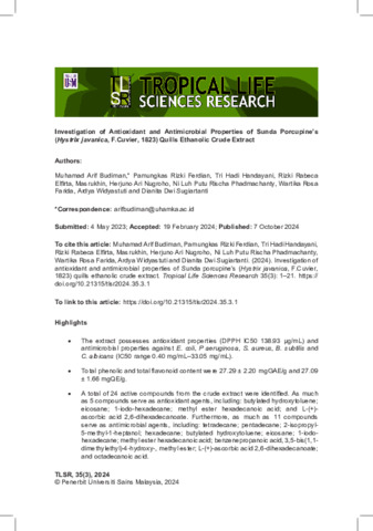 Budiman, Muhamad Arif Investigation of Antioxidant and Antimicrobial Properties of Sunda Porcupine’s (Hystrix javanica, F.Cuvier, 1823) Quills Ethanolic Crude Extract. Tropical Life Sciences Research.