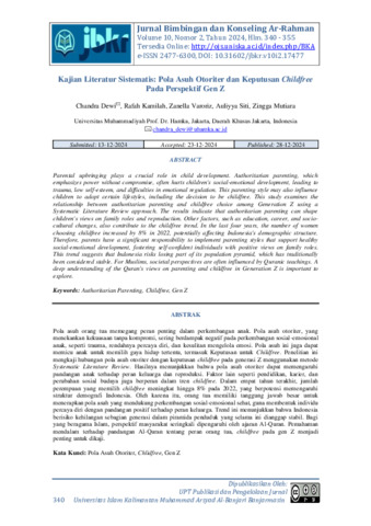 Chandra Dewi S., CDS (2024) Artikel penelitian Pola Asuh otoriter dengan keputusan Childfree dari Gen Z. Jurnal Bimbingan dan Konseling Ar-Rahman, 10 (2). pp. 340-345. ISSN 2477-6300