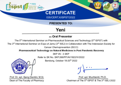 Yeni, Yeni Sertifikat The 5 th International Seminar on Pharmaceutical Sciences and Technology (5th ISPST) with The 3 rd International Seminar on Expo of Jamu (3rd ISEJ) in Collaboration with The Indonesian Society for Cancer Presenter. Universitas Padjadjaran.