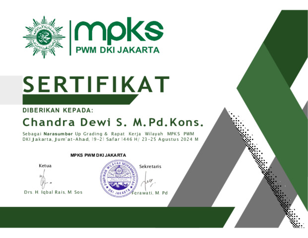 Chandra Dewi S., CDS sertifikat dan surat tugas narsum upgrading MKPS PWM DKI Jakarta - gasal 2024. Universitas Muhammadiyah Prof. DR. HAMKA. (Unpublished)