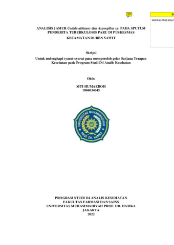 Siti, Humaeroh dan Wijiastuti, Wijiastuti (2022) ANALISIS JAMUR Cadida albicans dan Aspergillus sp. PADA SPUTUM PENDERITA TUBERKULOSIS PARU DI PUSKESMAS KECAMATAN DUREN SAWIT. Bachelor thesis, UNIVERSITAS MUHAMMADIYAH PROF. DR. HAMKA.