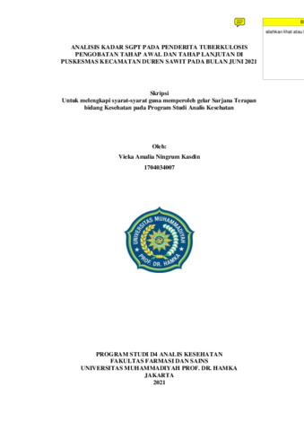Vieka, Amalia Ningrum Kasdin dan Saeful, Rahmad dan Ratih, Kartika Dewi (2021) ANALISIS KADAR SGPT PADA PENDERITA TUBERKULOSIS PENGOBATAN TAHAP AWAL DAN TAHAP LANJUTAN DI PUSKESMAS KECAMATAN DUREN SAWIT PADA BULAN JUNI 2021. Bachelor thesis, UNIVERSITAS MUHAMMADIYAH PROF. DR. HAMKA.
