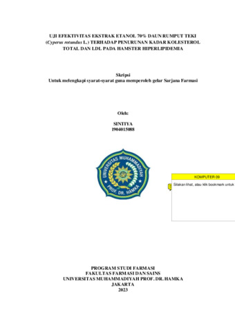 Sintiya, Sintiya dan Dwitiyanti, Dwitiyanti (2023) UJI EFEKTIVITAS EKSTRAK ETANOL 70% DAUN RUMPUT TEKI (Cyperus rotundus L.) TERHADAP PENURUNAN KADAR KOLESTEROL TOTAL DAN LDL PADA HAMSTER HIPERLIPIDEMIA. Bachelor thesis, Universitas Muhammadiyah Prof Dr HAMKA.