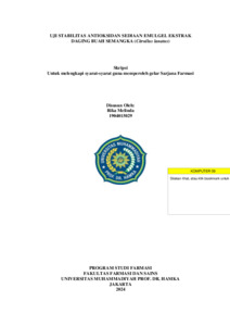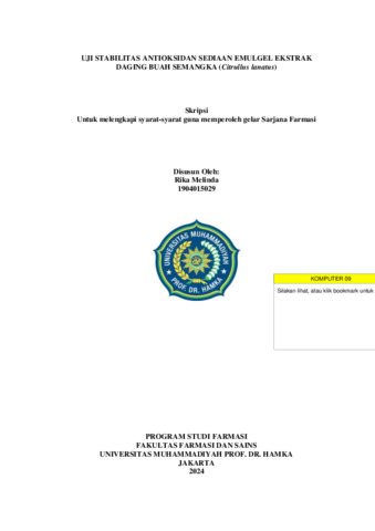 Rika, Melinda dan Kori, Yati dan Fitria Nugrahaeni, Fitria (2024) UJI STABILITAS ANTIOKSIDAN SEDIAAN EMULGEL EKSTRAK DAGING BUAH SEMANGKA (Citrullus lanatus). Bachelor thesis, Universitas Muhammadiyah Prof Dr HAMKA.