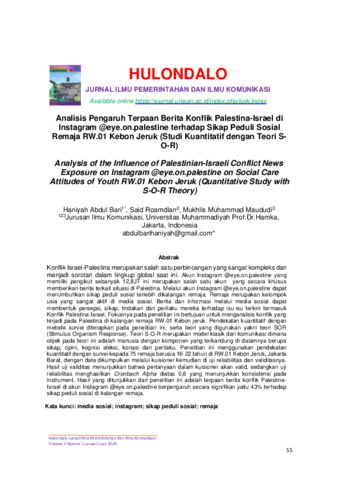 Mukhlish Muhammad Maududi, Mukhlish (2025) Pengaruh Terpaan Berita Konflik Palestina-Israel di Akun Instagram@ eye. on. palestine terhadap Sikap Peduli Sosial di Kalangan Remaja (Survei pada Remaja RW. 01 Kebon Jerok). Hulondalo Jurnal Ilmu Pemerintahan dan Ilmu Komunikasi, 4 (1).