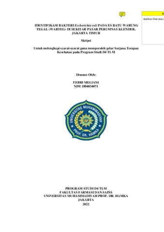 Febri, Meliani dan Herlina, Herlina dan Hurip, Budi Riyanti (2022) IDENTIFIKASI BAKTERI Escherichia coli PADA ES BATU WARUNG TEGAL (WARTEG) DI SEKITAR PASAR PERUMNAS KLENDER, JAKARTA TIMUR. Bachelor thesis, UNIVERSITAS MUHAMMADIYAH PROF. DR. HAMKA.