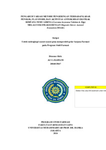 Alya, Raihani dan Agustin, Yumita dan Ni Putu, Ermi Hikmawati (2024) PENGARUH VARIASI METODE PENGERINGAN TERHADAP KADAR FENOLIK, FLAVONOID, DAN AKTIVITAS ANTIOKSIDAN EKSTRAK RIMPANG TEMU GIRING (Curcuma heyneana Valeton & Zijp) MELALUI EKSTRAKSI DENGAN Magnetic Stirrer Assisted Extraction (MSAE. Bachelor thesis, UNIVERSITAS MUHAMMADIYAH PROF. DR. HAMKA.