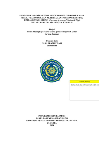 Dara, Prameswari dan Agustin, Yumita dan Ni Putu, Ermi Hikmawati (2024) PENGARUH VARIASI METODE PENGERINGAN TERHADAP KADAR FENOL, FLAVONOID, DAN AKTIVITAS ANTIOKSIDAN EKSTRAK RIMPANG TEMU GIRING (Curcuma heyneana Valeton & Zijp) MELALUI EKSTRAKSI DENGAN SONIKAS. Bachelor thesis, UNIVERSITAS MUHAMMADIYAH PROF. DR. HAMKA.