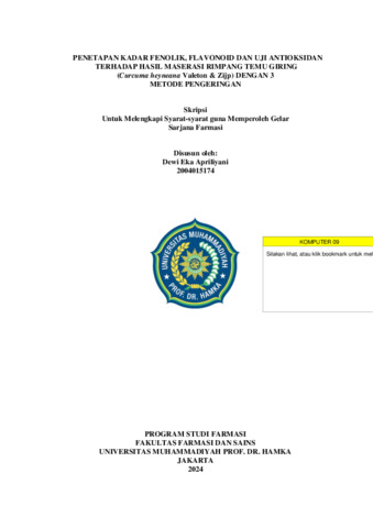 Dewi, Eka Apriliyani dan Agustin, Yumita dan Endang, Hanani (2024) PENETAPAN KADAR FENOLIK, FLAVONOID DAN UJI ANTIOKSIDAN TERHADAP HASIL MASERASI RIMPANG TEMU GIRING (Curcuma heyneana Valeton & Zijp) DENGAN 3 METODE PENGERINGAN. Bachelor thesis, UNIVERSITAS MUHAMMADIYAH PROF. DR. HAMKA.