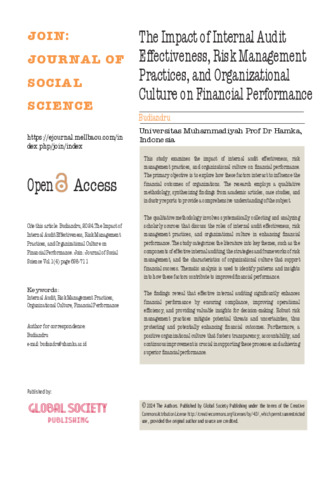 Budiandru, Budiandru The Impact of Internal Audit Effectiveness, Risk Management Practices, and Organizational Culture on Financial Performance. The Impact of Internal Audit Effectiveness, Risk Management Practices, and Organizational Culture on Financial Performance, 1 (4). pp. 698-711.