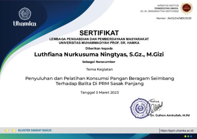 Luthfiana Nurkusuma Ningtyas, Luthfiana Nurkusuma Ningtyas PENYULUHAN DAN PELATIHAN KONSUMSI PANGAN BERAGAM SEIMBANG TERHADAP BALITA DI PRM SASAK PANJANG. UHAMKA.