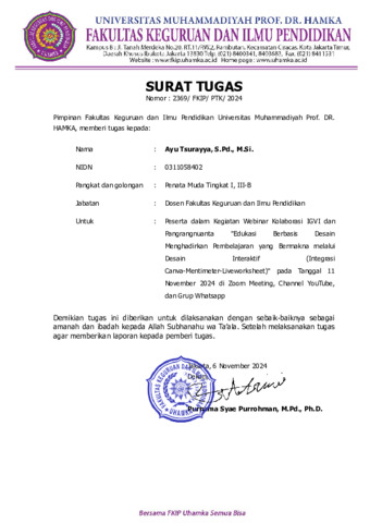 Tsurayya, Ayu Surat tugas dan sertifikat webinar cara praktis membuat integrasi perencanaan pembelajaran dan asesmen dengan Edcafe AI. Universitas Muhammadiyah Prof. DR. HAMKA. (Unpublished)