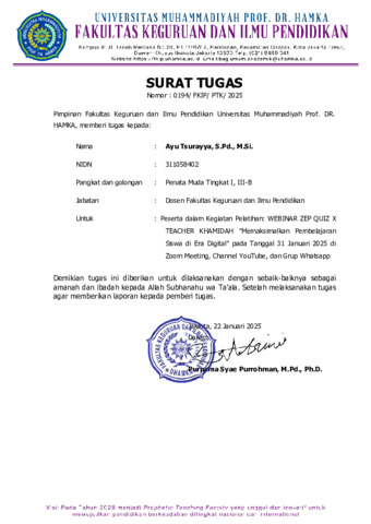 Tsurayya, Ayu Surat tugas dan sertifikat pelatihan ZEP QUIZ X Teacher Khamidah "Memaksimalkan Pembelajaran Siswa di Era Digital". Universitas Muhammadiyah Prof. DR. HAMKA. (Unpublished)