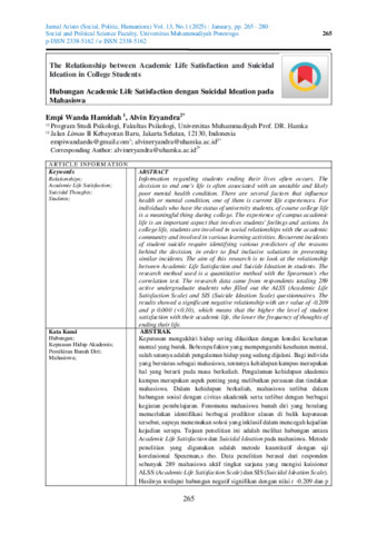 Hamidah, Empi Wanda dan Eryandra, Alvin (2024) The Relationship between Academic Life Satisfaction and Suicidal Ideation in College Students. Journal ARISTO, 13 (1). pp. 265-280. ISSN 2527-8444