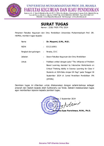 Mayarni, Mayarni The Influence of Problem Based Learning Assisted by Interactive Worksheets on Critical Thinking Ability in Science Learning for Class V Students at SDN Batu Ampar 09 Pagi. Jurnal Penelitian Pendidikan IPA.