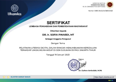 pinardi, sofia Sertifikat "PELATIHAN LITERASI DIGITAL DALAM RANGKA MENUMBUHKAN KEPEDULIAN TERHADAP LINGKUNGAN HIDUP DI SDN SUSUKAN 09 PAGI JAKARTA TIMUR. uhamka. (Unpublished)
