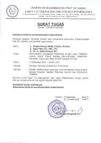 pinardi, sofia Surat Tugas,"pengabdian Masyarakat dengan Judul "Pelatihan Literasi Digital Dalam Rangka Menumbuhkan Kepedulian Terhadap Lingkungan Hidup Di SDN Susukan 09 Pagi". uhamka. (Unpublished)