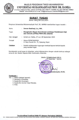 Surat Tugas Menghadiri Rapat Koordinasi Lembaga Haji dan Umroh PWM DKI Jakarta